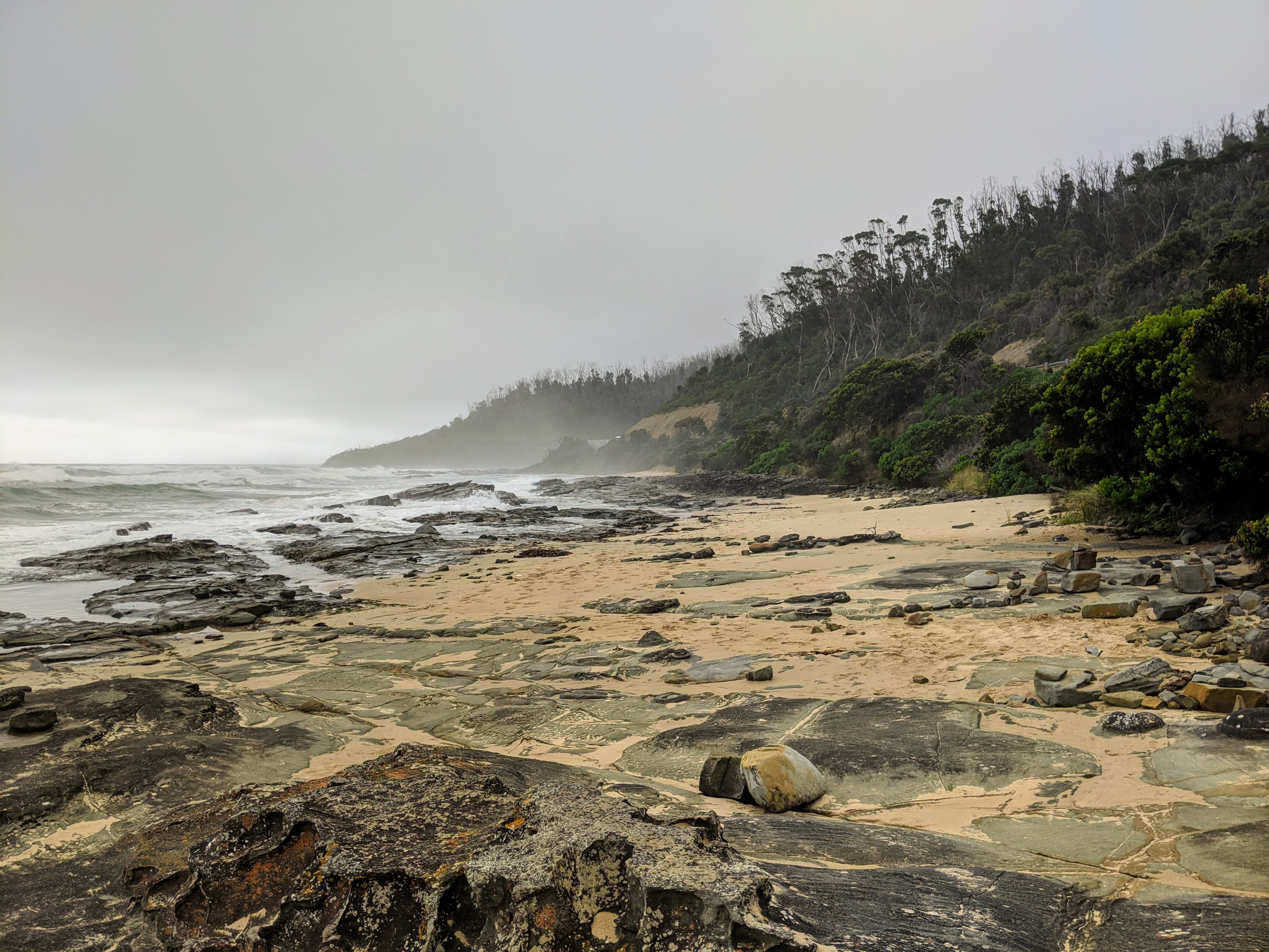 Beautiful weather for most of the day apart from the gale force winds and sandstorm (unexpected exfoliation for all exposed skin) in pouring rain when crossing the Bay of Fires Bay. Luckily it only lasted for about 20 minutes and we dried out very quickly when we reached Shelly Bay