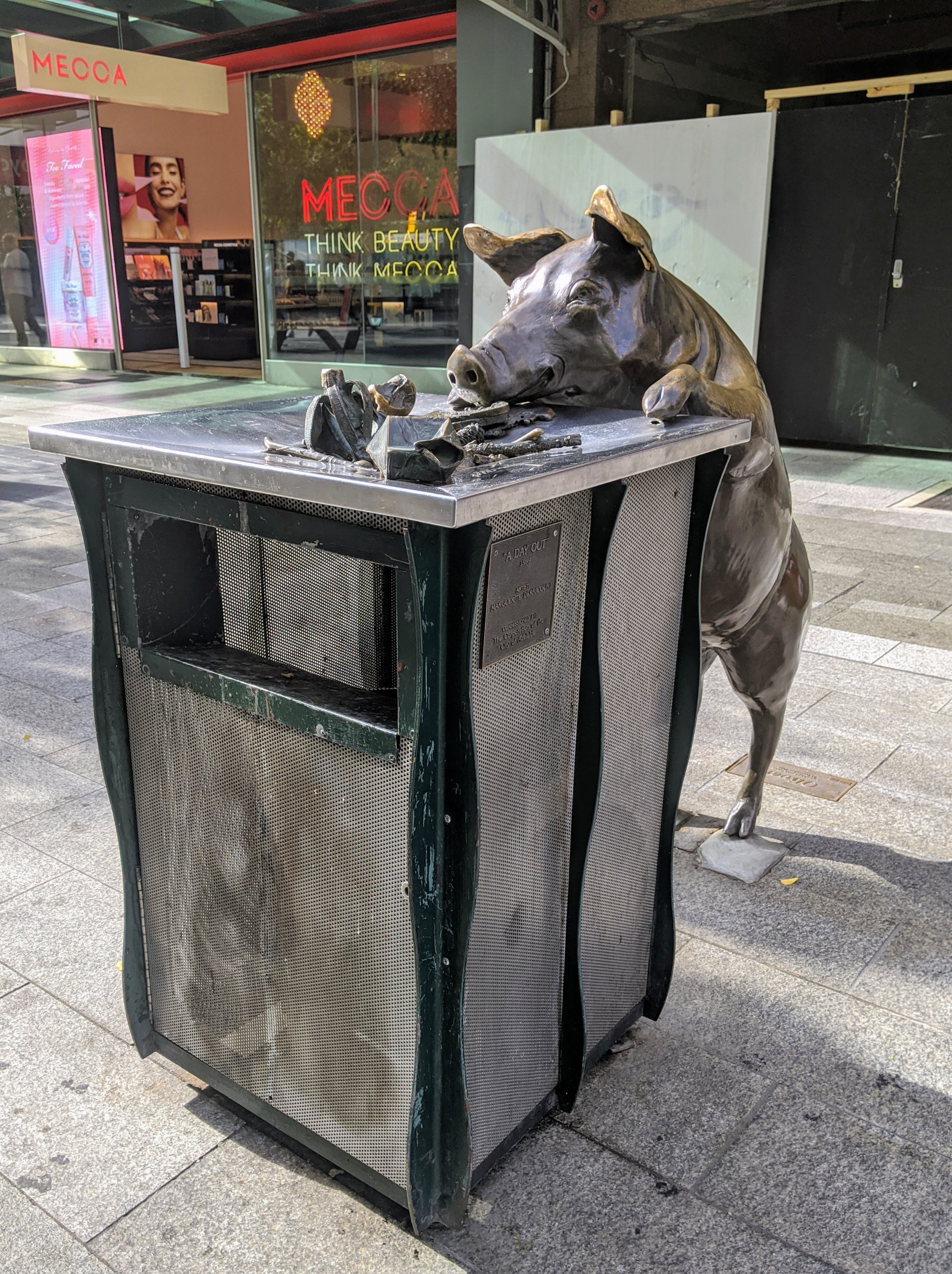 Followed by a sculpture of a group of life-sized pigs, officially known as ‘A Day Out’ by Marguerite Derricourt. The four pigs – Truffles (the standing pig), Horatio (the sitting pig), Oliver (the pig at the bin) and Augusta (the trotting pig) – are depicted in lively poses as if they were walking the street, greeting shoppers, and sniffing out a bargain.